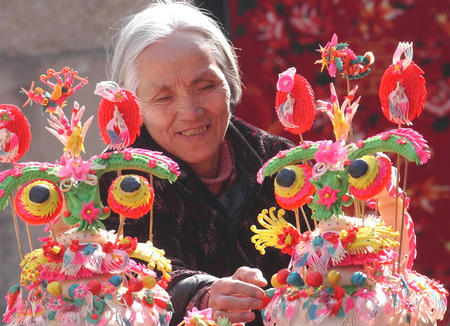 Bei den im mittleren und n?rdlichen Teil von Shaanxi weitverbreiteten Mehlblumen handelt es sich um eine Art von Mo (Br?tchen), daher auch der Name Blumen-Mo. Die Mehlblume ist eine typische Repr?sentantin der Kunst der Mehlskulptur. Neben Blumen sind auch V?gel, Fische, Insekten, Gemüse und Obst beliebte Figuren. Die Figuren werden den Vorfahren geopfert, Senioren als Glückwunsch überreicht oder zur Zierde aufgestellt. Mehlblumen sind essbar und gleichzeitig ein volkstümliches Kunsthandwerk lokaler Pr?gung.