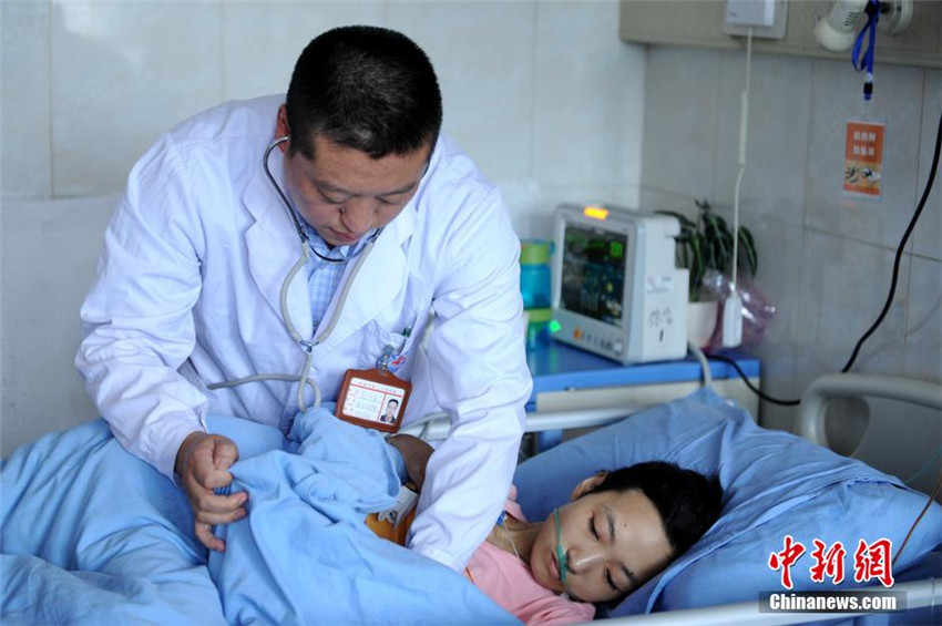 | Ein Arzt untersucht die bewusstlose Zhou. |