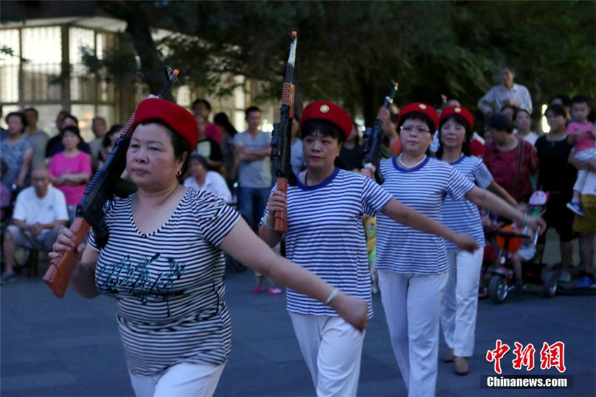| Auf dem Platz vor der ?Raffles City“ in Beijing führen einige Frauen und M?nner mittleren Alters jeden Tag einen Tanz auf, der an den anti-japanischen Krieg erinnert. |