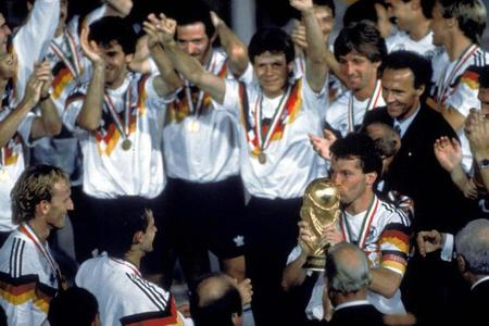 | Sommer 1990, Italien. Im Finale von Rom besiegt die deutsche Mannschaft Argentinien mit Kapit?n Diego Armando Maradona mit 1:0. Beckenbauer war damit der erste Deutsche, der den WM-Pokal als Spieler und als Trainer gewinnen konnte. |