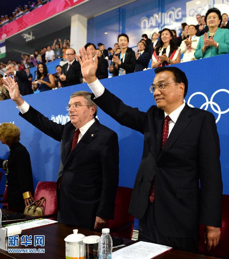 | Li Keqiang und Thomas Bach begrü?en die Zuschauer. (Foto: Ma Zhancheng/Xinhua) |