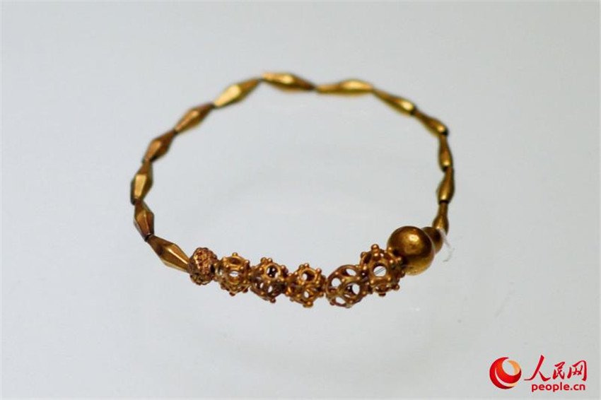 | Das goldene Armband wurde im Jahr 1978 ausgegraben. Der dekorative Stil ist sehr beliebt in Südostasien. Es ist deshalb ein guter Beweis der maritimen Seidenstra?e. |