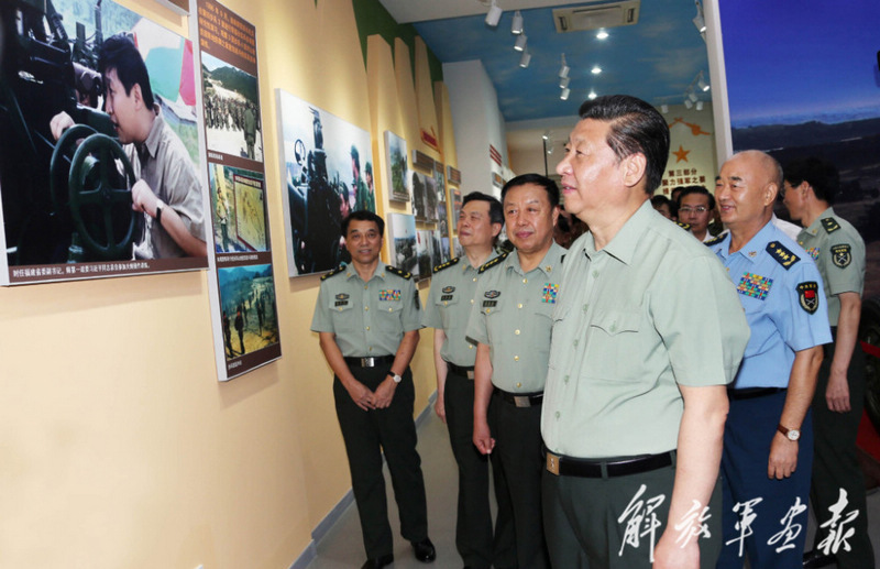 | An einer Milit?rausstellung im Juli 2014: Staatspr?sident Xi Jinping steht vor einem alten Bild von sich und erinnert sich an die Zeit in der Flakdivision der Reservetruppen in Fujian. |