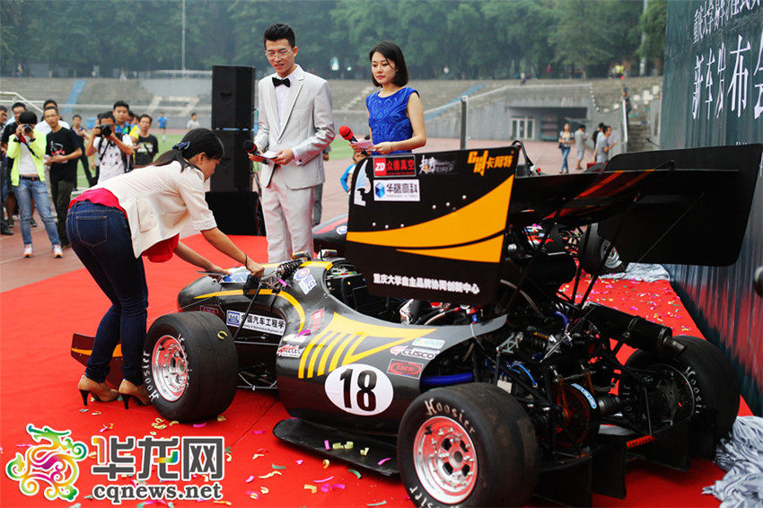 | Ein Teammitglied klebt Abzeichen auf die Rennwagen. |