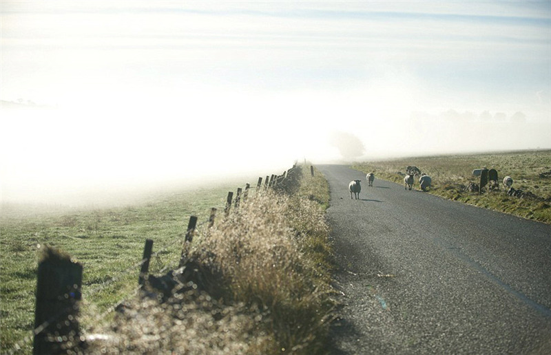 | Je mehr sich der Nebel verzieht, desto deutlicher wird die Schafherde sichtbar. |