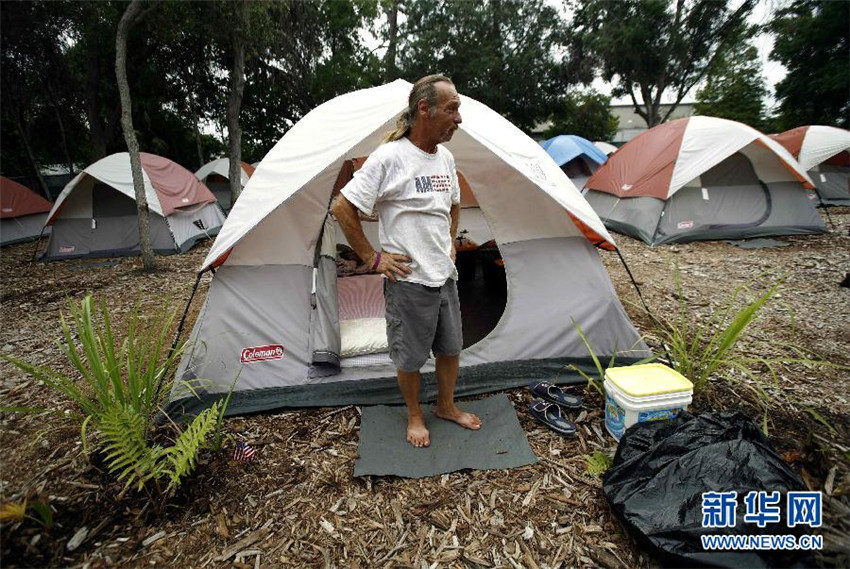 | Der arbeitslose Eric Waterman lebt gemeinsam mit seiner Frau in einem Zelt in Pinellas Park im US-Bundesstaat Florida. Das Zelt wurde ihnen von einer gemeinnützigen Organisation zur Verfügung gestellt. |