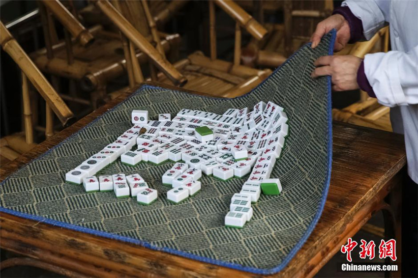 | In einem Teehaus r?umt ein Kellner ein Mahjong-Spiel weg. |