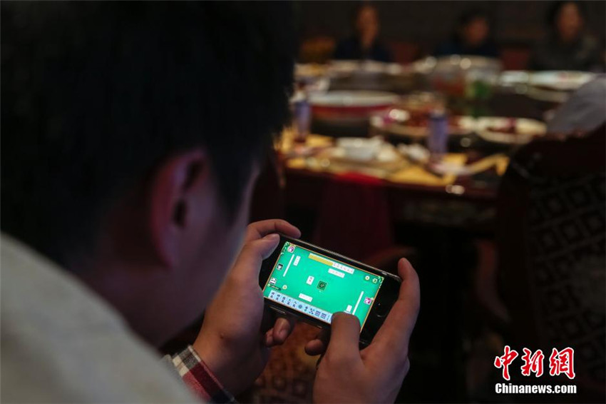 | Ein Junge spielt an einer Familienvereinigung Mahjong auf seinem Handy. |