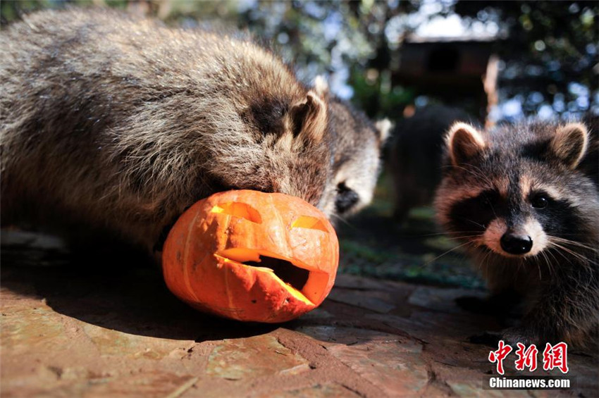 | In einem Wildpark in Yunnan starren die Waschb?ren neugierig eine Kürbislaterne an. (Foto: Liu Ranyang) |