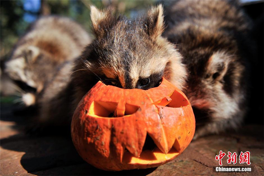 | In einem Wildpark in Yunnan starren die Waschb?ren neugierig eine Kürbislaterne an. (Foto: Liu Ranyang) |