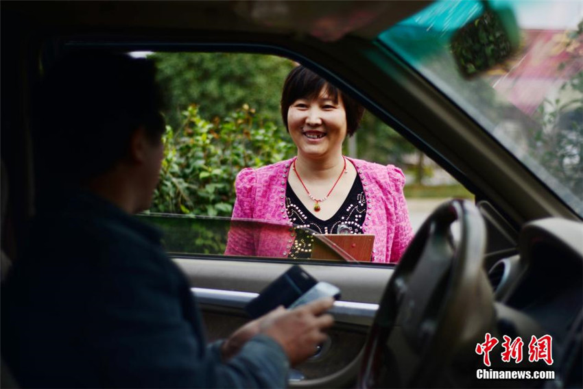 | Xing Qiaomei redet l?chelnd mit dem Kunden. |