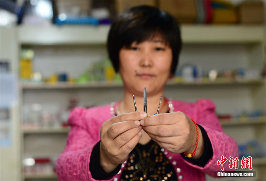 | Xing Qiaomei zeigt stolz die Graviermesser. Das kleine Messer stützt das Leben der ganzen Familie. |