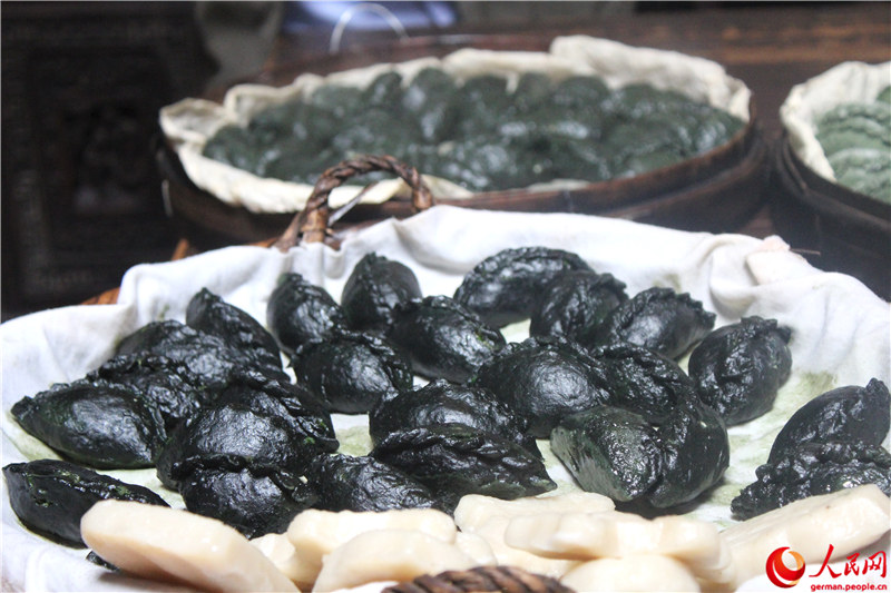 | Einwohner des Dorfes zeigen die Herstellung einer Spezialit?t der Region: Die Qingming-Jiaozi werden traditionellerweise w?hrend dem Totengedenkfest gegessen. |
