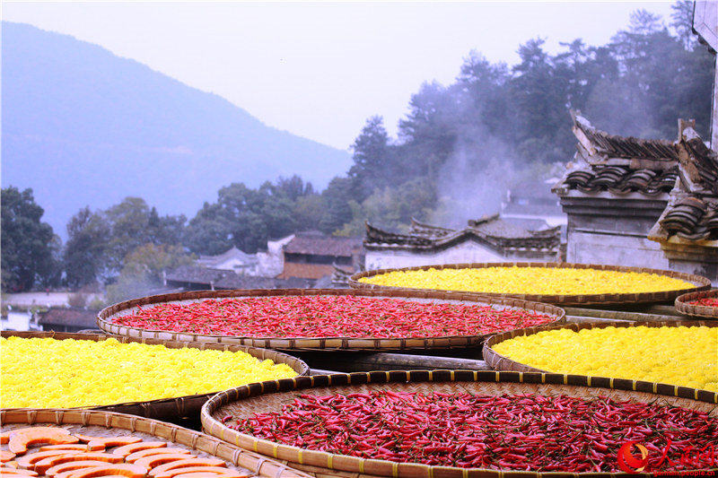 | Im Herbst werden rote Chilischoten, orange Kürbisschnitze und gelbe Chrysanthemenblüten zum Trocknen auf die D?cher gelegt. Zusammen ergeben sie eine wunderbare Farbenpracht. |