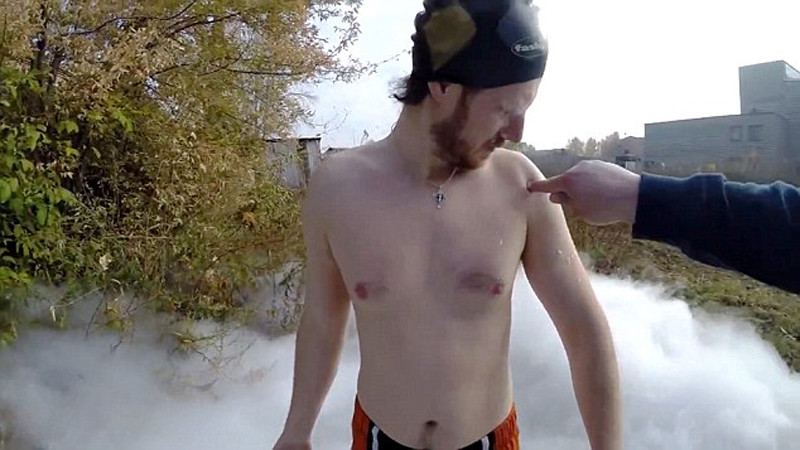 | Ein Freund prüft, ob Konowalows Haut gefroren ist. |