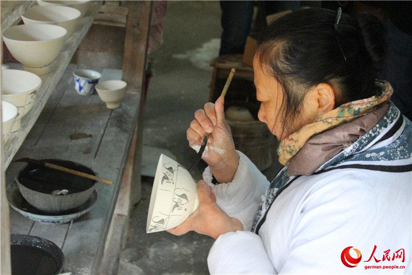 | Der letzte Schritt vor dem Brennen: die Bemalung. Die Arbeiterin malt mit einer speziellen Tinte ein Kamelien-Muster auf die Schale. Die schwarze Tinte wird sich w?hrend dem Brennprozess dank einer chemischen Reaktion in eine klare, blaue Farbe umwandeln. |