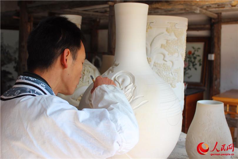 | Modellier-Meister Xia Bo arbeitet an einer Porzellanvase. Normalerweise ben?tigt Xia einen Monat für ein komplexes Werk dieser Gr??e. Xia lernte das Modellieren, das mit einer Schnitztechnik verglichen werden kann, als Jugendlicher. Nach etwa vier Jahren war er f?hig, einfache Motive zu gestalten. Für schwierigere Motive wie dasjenige, das er vor Kurzem begonnen hat, braucht es l?ngere Erfahrung. Für seine Arbeit benutzt Xia keine Schablone oder Vorlage – er l?sst seiner Inspiration freien Lauf. |