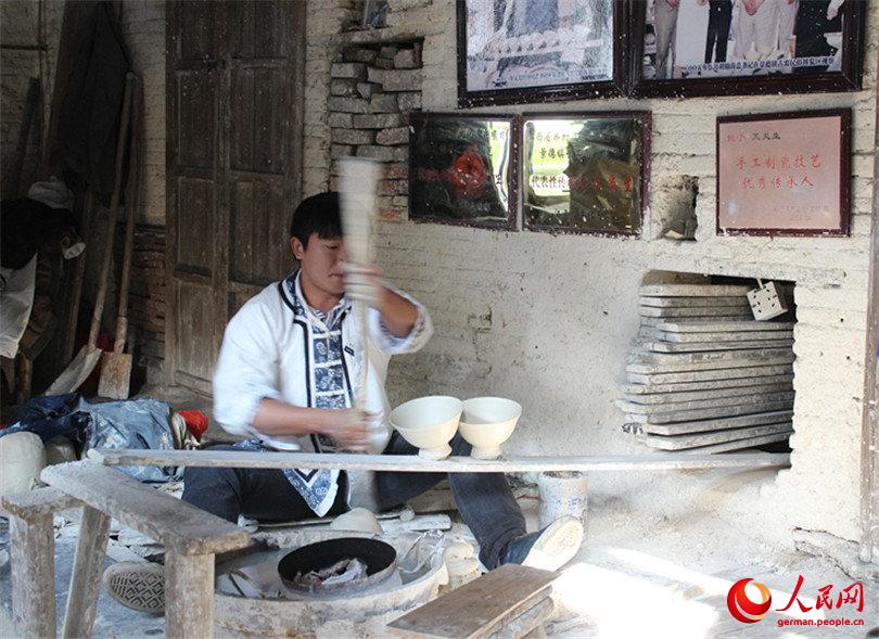 | Obwohl der wachsame Lehrer die Arbeit seines Z?glings immer noch akribisch überwacht, kann Wang Shaohui inzwischen ohne seinen Gro?vater die Aufgabe der Formgebung übernehmen. Er produziert hier jeden Tag ungef?hr 100 Schalen. |