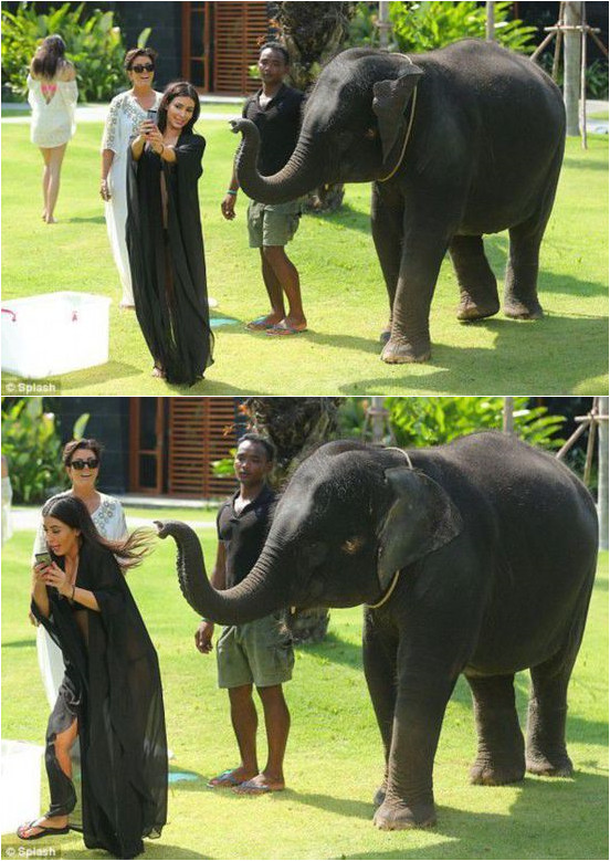 US-Reality-Star und Model Kim Kardashian m?chte sich mit einem Elefanten ablichten. Letzterer scheint jedoch nicht in der Stimmung für ein Selfie zu sein.