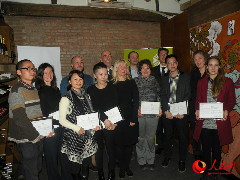 | Gruppenfoto der Teilnehmer 2014 mit dem Leiter des Kulturreferats der deutschen Botschaft Peking Enrico Brandt, dem Leiter des Goethe-Instituts Peter Anders, Herrn Caspar Welbergen von der Stiftung Mercator, der Seminarleiterin in Hamburg Dr. Gesa Birnkraut von dem Institut für Kulturkonzepte Hamburg e.V. (Mitte) sowie der Seminarleiterin in Shanghai Katja Hellkoetter von CONSTELLATIONS International (Zweite rechts). |