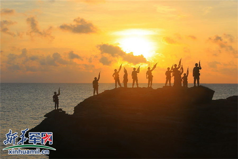 Wachsoldaten begrü?en den Sonnenaufgang auf der Insel Shidao (Rocky Island)