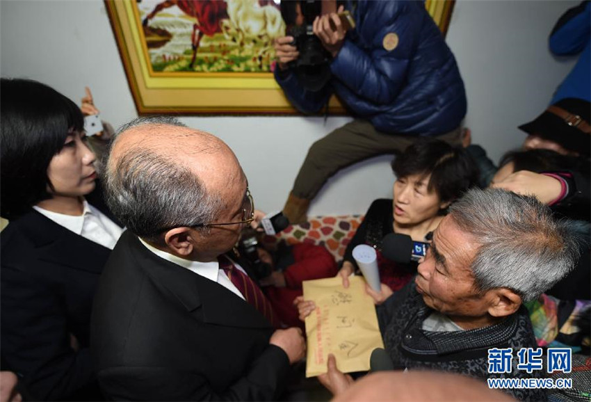 Der Vizepr?sident des H?heren Volksgericht Zhao Jianping (zweiter von links) gibt das ?Schmerzensgeld“ an Hugjiltus Eltern weiter.