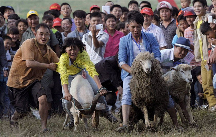 | An einem Fest in Fengshan reiten die Bewohner auf Schafen und Ziegen. |