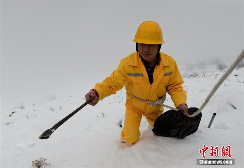 | Verbunden mit einem Absicherungsseil holt Peng den von Touristen weggeworfenen Abfall auf der Klippe. |