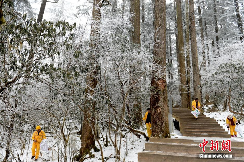 Die Müllm?nner sammeln den Abfall auf einer Treppe auf.