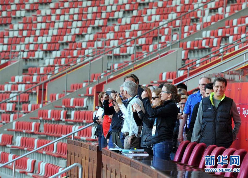 Die IOC-Kommission im Beijinger Nationalstadion, dem ?Vogelnest“.