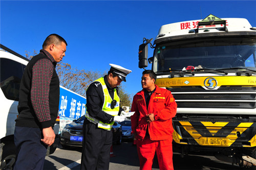 Ein Verkehrspolizist befragt an einer Stra?ensperre einen Lastwagenfahrer. Foto vom 13. November 2014.