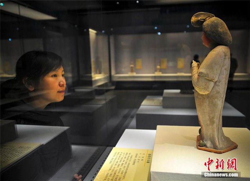 Die Besucher bestaunen die bunten Tonfiguren der Palastdamen in der Tang-Dynastie.