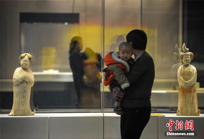 Die Besucher bestaunen die bunten Tonfiguren der Palastdamen in der Tang-Dynastie.