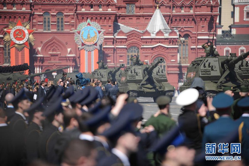 | Eine Formation von russischen Panzernrollt über den Roten Platz. |