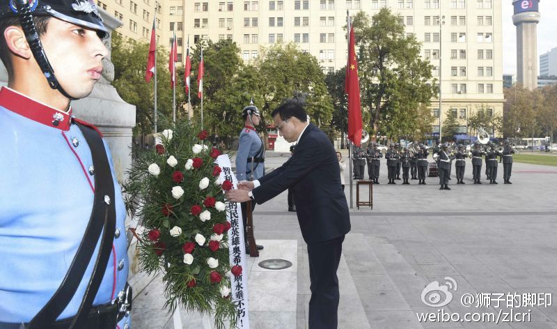 Li Keqiang begann am Sonntagnachmittag seinen ersten offiziellen Besuch in Chile. Am zweiten Tag legte Chinas Ministerpr?sident am Denkmal von Bernardo O’Higgins (1778-1842) in der Hauptstadt Santiago einen Kranz nieder.