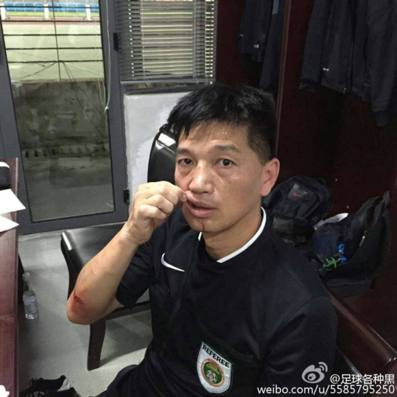 Der assistierende Schiedsrichter Zhan Wei (45) zeigt seine Wunden an Arm und Mund.