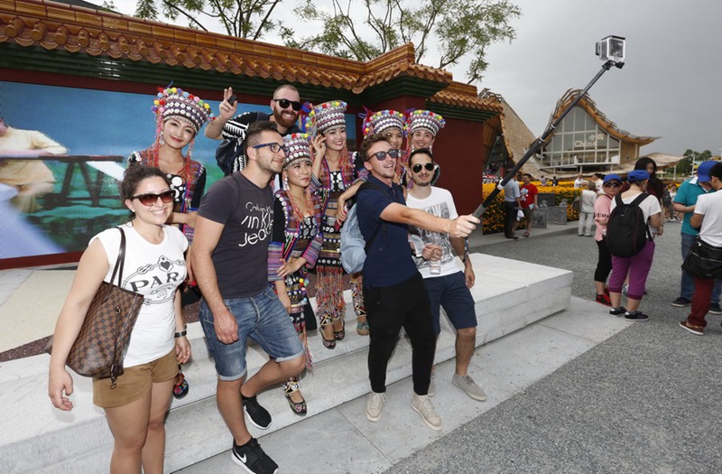 | Besucher aus Italien beim Schnappschuss mit T?nzerinnen aus der südwestchinesischen Provinz Yunnan. |