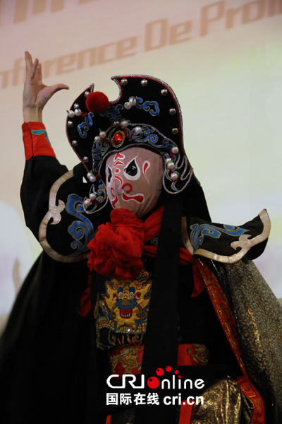 | Hong Lei ist ein bekannter chinesischer Künstler des Maskenwechsels, der sein K?nnen auf der Pressekonferenz in Brüssel zum Besten gibt. |