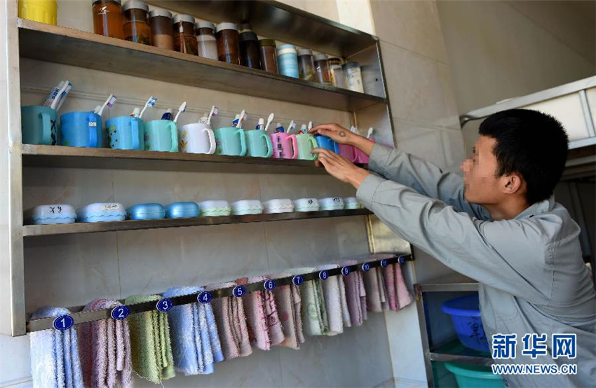 | A Long r?umt seine Zahnputzsachen im Gemeinschaftsbad auf. |