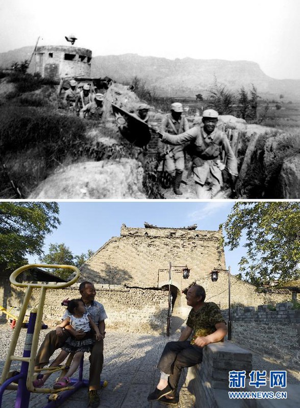 | Oben: Soldaten der Achten Route-Armee auf dem Schlachtfeld von Niangziguan (Kreis Pingding, Provinz Shanxi); Unten: Die heutigen Bewohner unterhalten sich vor dem Turm von Niangziguan. |