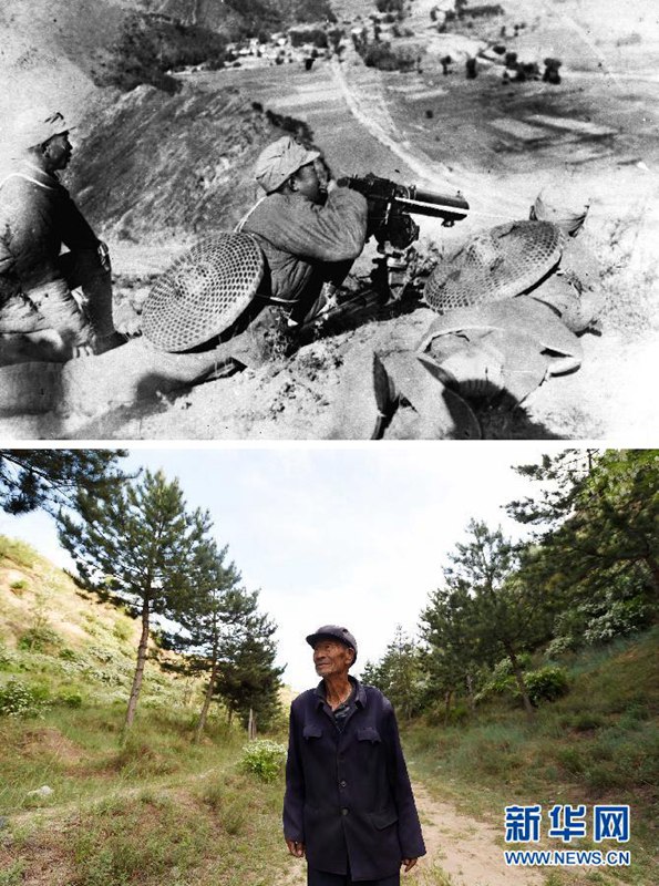 | Oben: Die chinesische Armee greift die japanischen Eindringlinge aus dem Hinterhalt an. Unten: Der 83-J?hrige Li Shicai steht auf dem Weg, wo damals die japanischen Aggressoren überfallen wurden. Sein ?lter Bruder Li Tinghuai war damals Führer der Achten Route-Armee. |