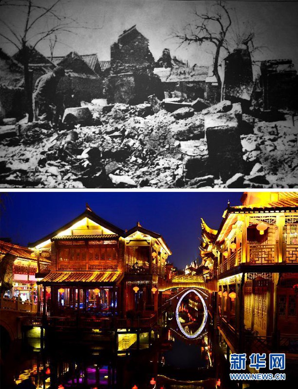 | Oben: Der nordchinesische Kreis wurde bei der berühmten Schlacht von Taierzhuang in Schutt und Asche gelegt. Unten: N?chtlicher Anblick des Kreises Taierzhuang im Jahr 2014 |