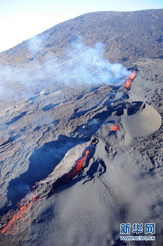 | Die Eruption des Piton de la Fournaise aus der Vogelperspektive. |