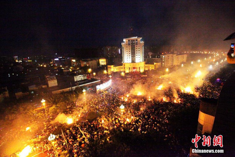 | Das Fackelfest der Yi aus der Vogelperspektive |