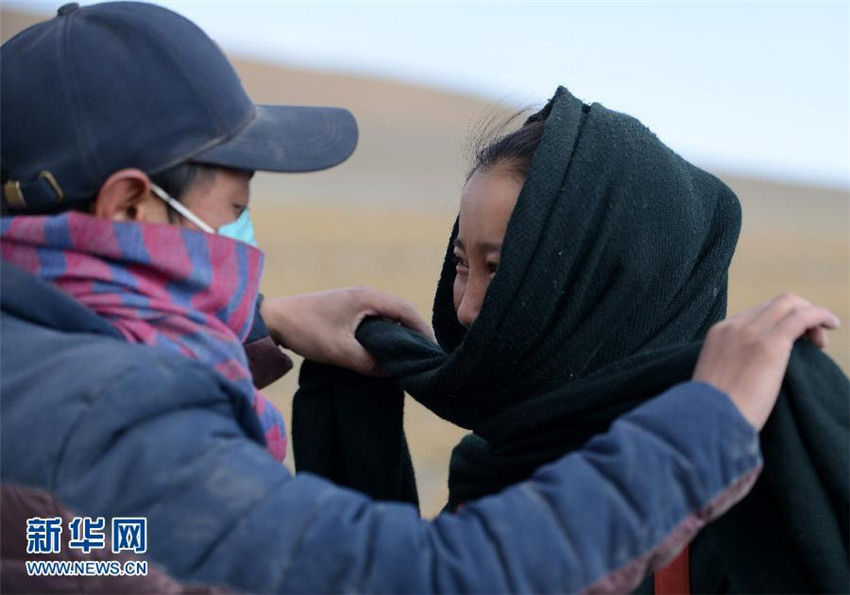 | Bamus Ehemann Dala stellt vor der Abfahrt seiner Frau sicher, dass ihr Kopftuch richtig sitzt. |