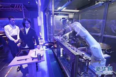 Das erste Nudelrestaurant mit Roboterkoch in Shanghai befindet sich im Probebetrieb. Zahlreiche G?ste werden davon angezogen und wollen eine Portion Nudeln von dem neuartigen Roboterkoch probieren, 24. Dezember 2015. Zwei Roboter sind in dem Gesch?ft besch?ftigt und jeder der Roboter ist für eine bestimmte vorprogrammierte Arbeit zust?ndig. Durchschnittlich ben?tigen die zwei Roboter für eine Portion Nudeln 90 Sekunden. Nudelrestaurants mit Roboterkoch gibt es auch in Japan. Der Besitzer hat das ursprüngliche Programm aktualisiert und zurück nach China geholt.