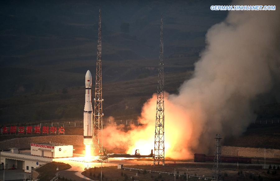 Ein neues Modell der chinesischen Tr?gerrakete ?Langer Marsch-6", die 20 Mikrosatelliten tr?gt, hebt um 7.01 vom Startplatz auf dem Startzentrum Taiyuan in der nordchinesischen Provinz Shanxi ab, 20, September 2015. Die neue Tr?gerrakete wird haupts?chlich für das Starten der Mikrosatelliten eingesetzt werden, w?hrend die 20 Mikrosatelliten zu den Weltraumtesten dienen werden.