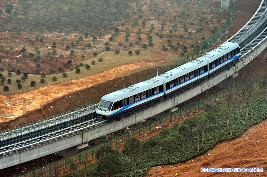 Ein System-Debugging wurde bei einer Magnetschwebebahn der mittleren Geschwindigkeit in Changsha, der Hauptstadt der zentralchinesischen Provinz Hunan, durchgeführt, 6. Januar 2016. Die 18,5 Kilometer lange Magnetschwebebahn-Strecke der mittleren Geschwindigkeit startet von der Südstadtion Changsha im Westen und führt zum Flughafen Huanghua im Osten. Die mit eigenen chinesischen Eigentumsrechten entwickelte Magnetschwebebahn wird in der ersten Jahresh?lfte einen Probelauf mit Fahrg?sten durchführen.