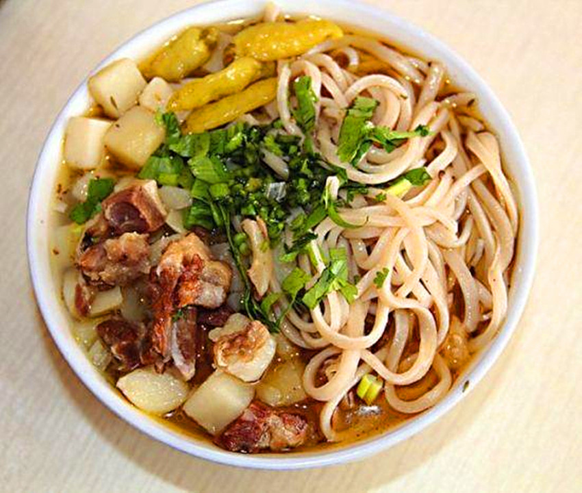 Die gehackten Nudeln werden dann in einen gro?en Topf gestreut hineingelassen. Nach dem Kochen werden sie in Schüssel angeboten. Man übergie?t sie normalerweise mit hei?er Sauer- oder Lammfleischbrühe. So wird sie die bekannte Leckerei.