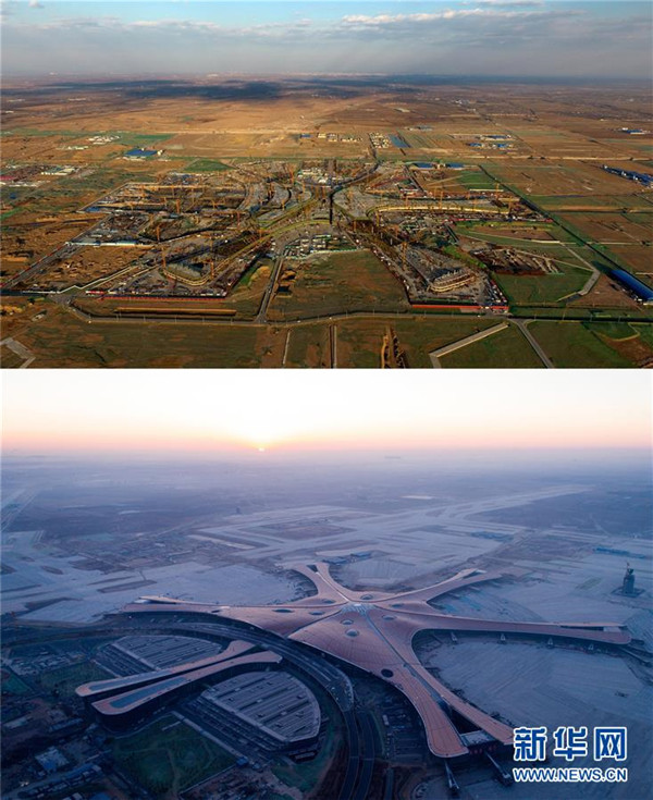 Unten: Die Fassade des Hauptgeb?udes des neuen Beijinger Flughafens ist fast fertig ausgestattet. (Foto vom 28. Dezember 2018)